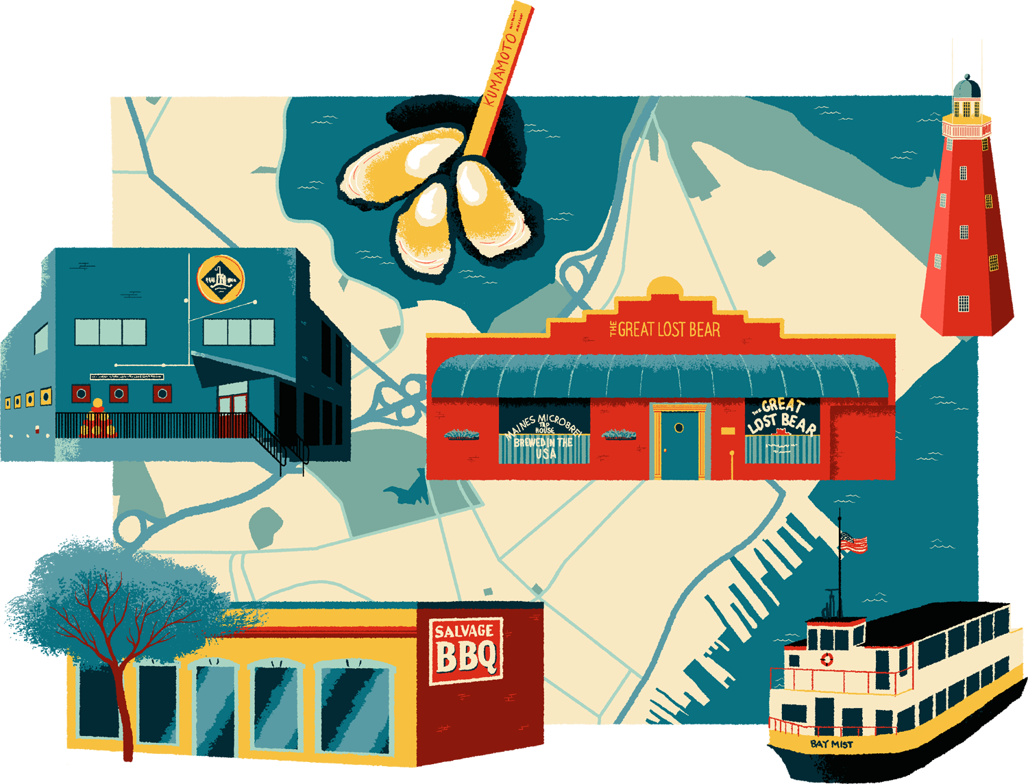 I worked with the American craft beer publication for almost years on a column entitled ‘Destinations’.Originally starting with postcard-style illustrations of the locations, after a few years their art department changed direction to have maps of the areas.